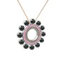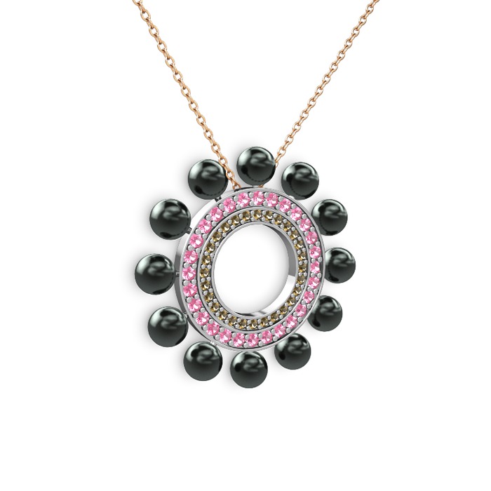 Siyah inci, dumanlı kuvars ve pembe kuvars 18 ayar beyaz altın kolye (40 cm rose altın rolo zincir)