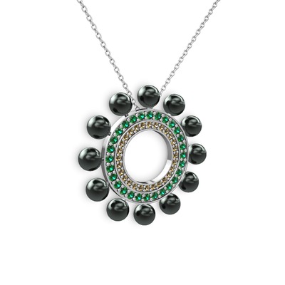 Siyah inci, dumanlı kuvars ve yeşil kuvars 18 ayar beyaz altın kolye (40 cm gümüş rolo zincir)