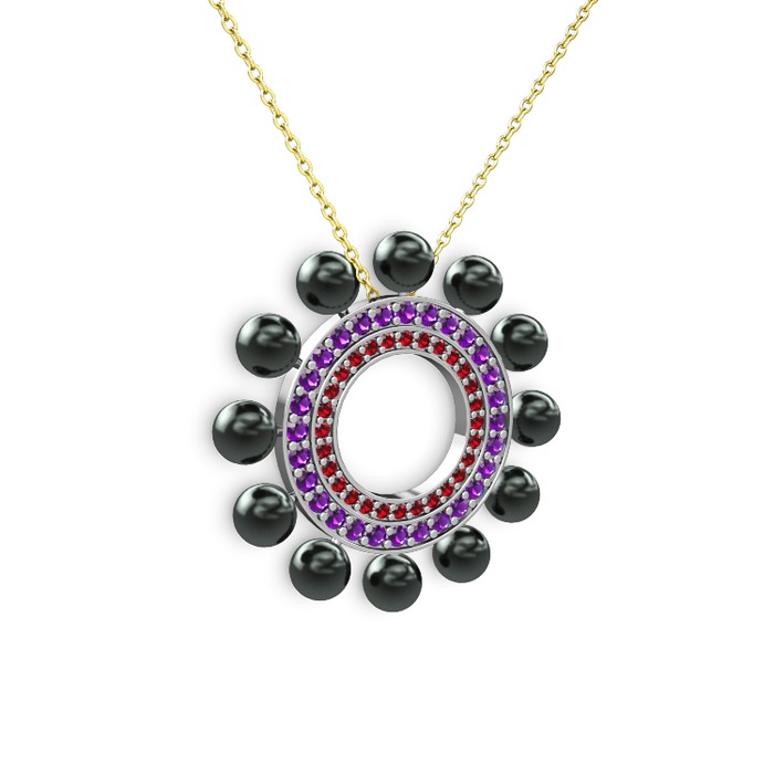 Siyah inci, garnet ve ametist 925 ayar gümüş kolye (40 cm altın rolo zincir)