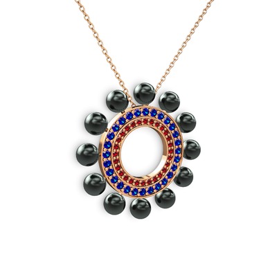 Siyah inci, garnet ve lab safir 8 ayar rose altın kolye (40 cm rose altın rolo zincir)