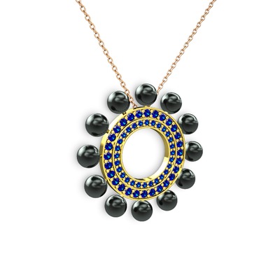 Siyah inci ve lab safir 18 ayar altın kolye (40 cm rose altın rolo zincir)