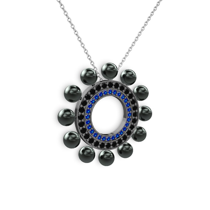 Siyah inci, lab safir ve siyah zirkon 925 ayar siyah rodyum kaplama gümüş kolye (40 cm beyaz altın rolo zincir)