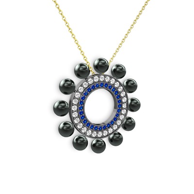 Siyah inci, lab safir ve swarovski 925 ayar siyah rodyum kaplama gümüş kolye (40 cm altın rolo zincir)