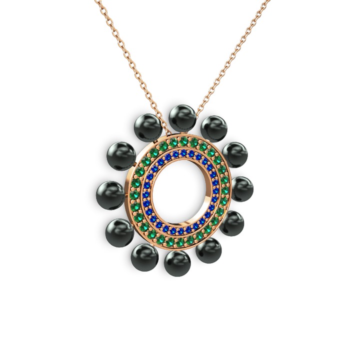 Siyah inci, lab safir ve yeşil kuvars 925 ayar rose altın kaplama gümüş kolye (40 cm rose altın rolo zincir)