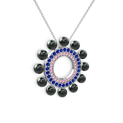 Siyah inci, pembe kuvars ve lab safir 14 ayar beyaz altın kolye (40 cm beyaz altın rolo zincir)