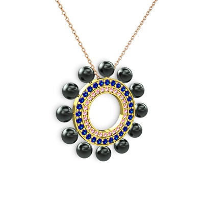 Siyah inci, pembe kuvars ve lab safir 8 ayar altın kolye (40 cm rose altın rolo zincir)