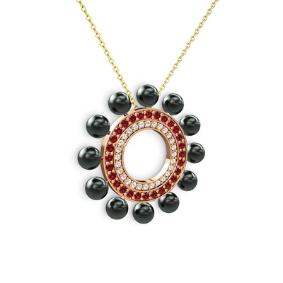 Siyah inci, pırlanta ve garnet 925 ayar rose altın kaplama gümüş kolye (0.42 karat, 40 cm altın rolo zincir)