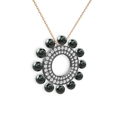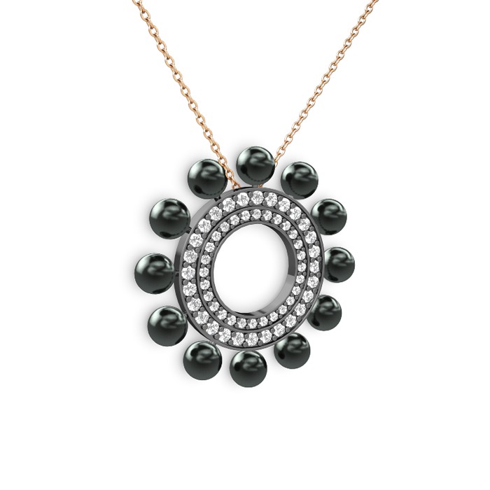 Siyah inci ve pırlanta 925 ayar siyah rodyum kaplama gümüş kolye (0.6664 karat, 40 cm rose altın rolo zincir)