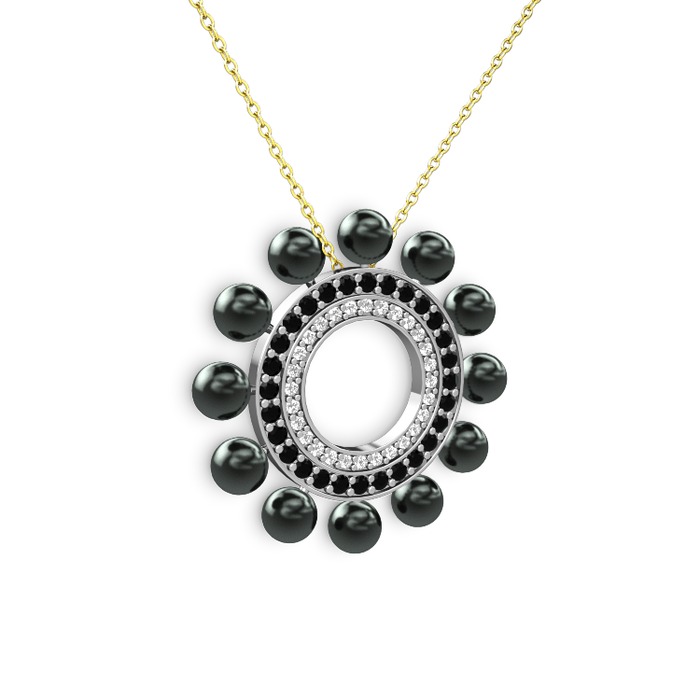 Siyah inci, pırlanta ve siyah zirkon 14 ayar beyaz altın kolye (0.42 karat, 40 cm altın rolo zincir)