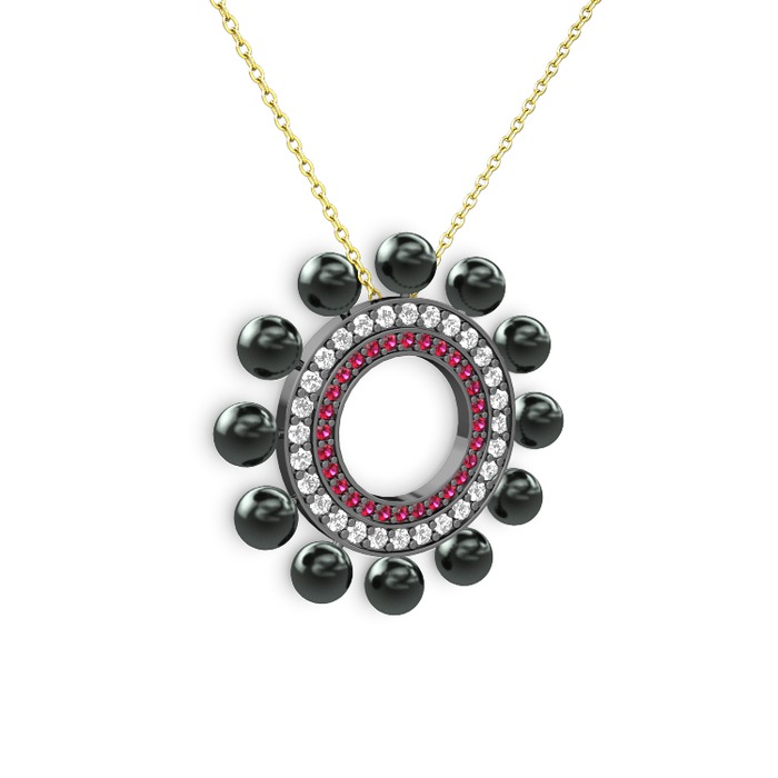 Siyah inci, rodolit garnet ve pırlanta 925 ayar siyah rodyum kaplama gümüş kolye (0.2464 karat, 40 cm altın rolo zincir)