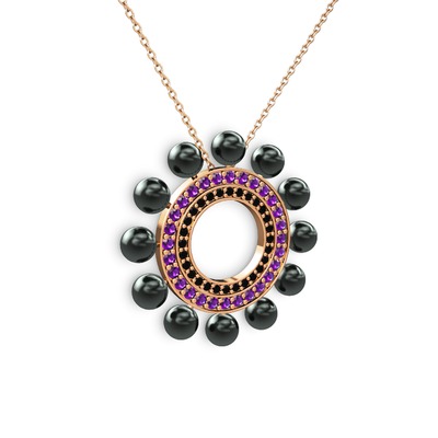 Siyah inci, siyah zirkon ve ametist 14 ayar rose altın kolye (40 cm gümüş rolo zincir)