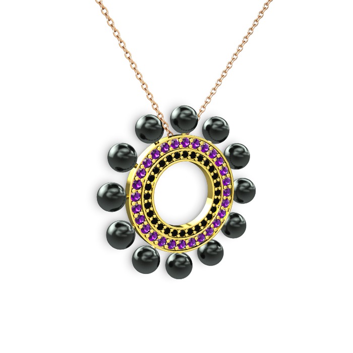 Siyah inci, siyah zirkon ve ametist 8 ayar altın kolye (40 cm gümüş rolo zincir)