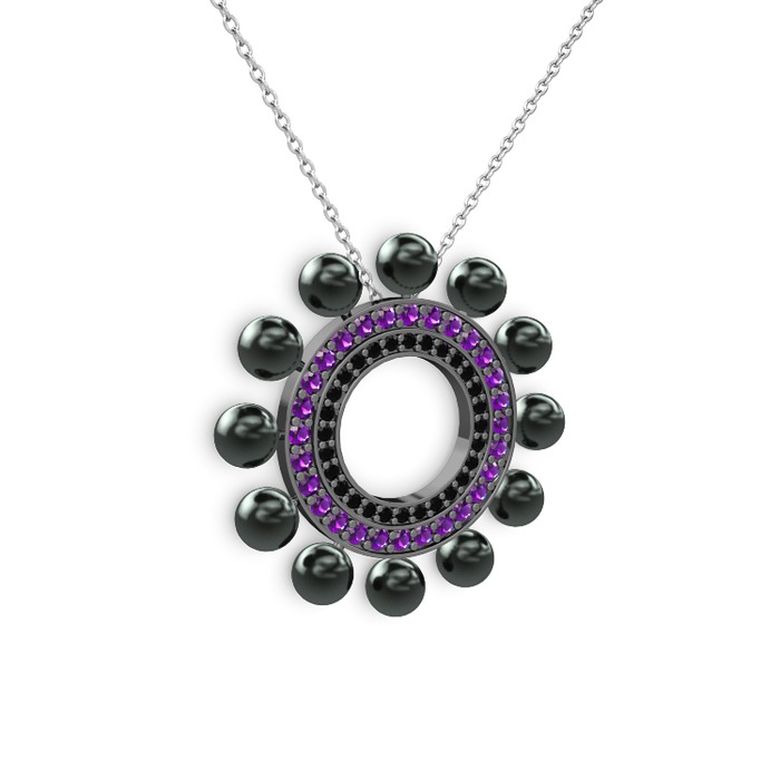 Siyah inci, siyah zirkon ve ametist 925 ayar siyah rodyum kaplama gümüş kolye (40 cm beyaz altın rolo zincir)