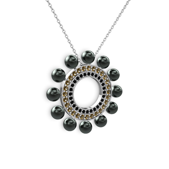 Siyah inci, siyah zirkon ve dumanlı kuvars 14 ayar beyaz altın kolye (40 cm beyaz altın rolo zincir)