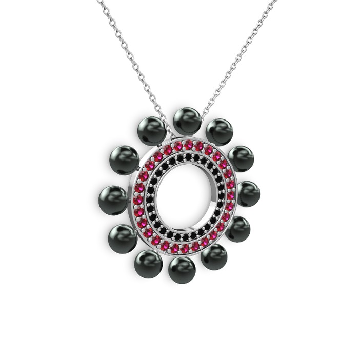 Siyah inci, siyah zirkon ve rodolit garnet 14 ayar beyaz altın kolye (40 cm beyaz altın rolo zincir)