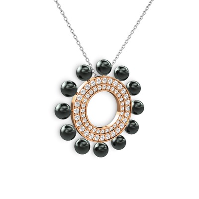 Siyah inci, swarovski ve pırlanta 925 ayar rose altın kaplama gümüş kolye (0.2464 karat, 40 cm beyaz altın rolo zincir)
