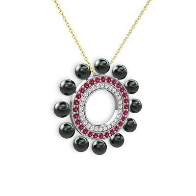 Siyah inci, swarovski ve rodolit garnet 925 ayar gümüş kolye (40 cm altın rolo zincir)