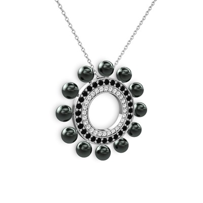 Siyah inci, swarovski ve siyah zirkon 18 ayar beyaz altın kolye (40 cm beyaz altın rolo zincir)