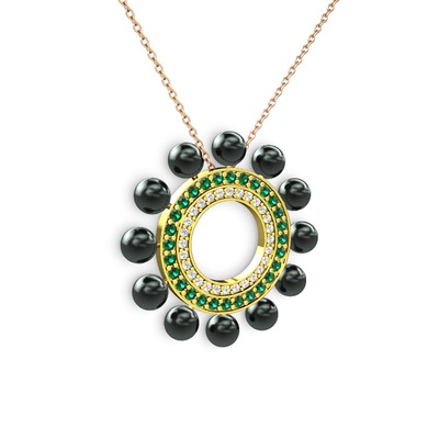 Siyah inci, swarovski ve yeşil kuvars 8 ayar altın kolye (40 cm rose altın rolo zincir)