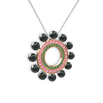 Siyah inci, yeşil kuvars ve pembe kuvars 14 ayar rose altın kolye (40 cm beyaz altın rolo zincir)