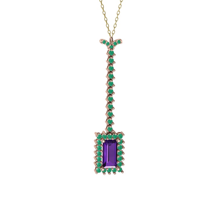 Ametist ve kök zümrüt 8 ayar rose altın kolye (40 cm altın rolo zincir)