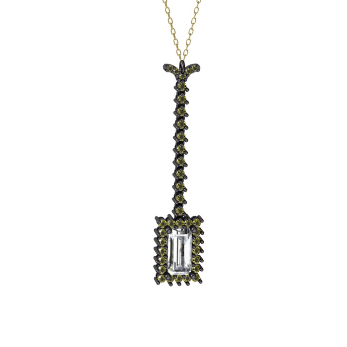 Beyaz zirkon ve peridot 925 ayar siyah rodyum kaplama gümüş kolye (40 cm altın rolo zincir)