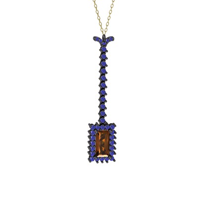 Dumanlı kuvars ve lab safir 925 ayar siyah rodyum kaplama gümüş kolye (40 cm altın rolo zincir)