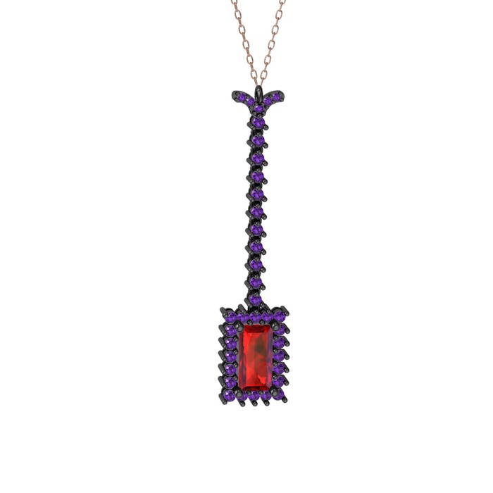 Garnet ve ametist 925 ayar siyah rodyum kaplama gümüş kolye (40 cm rose altın rolo zincir)