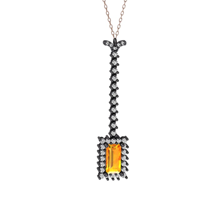 Sitrin ve beyaz zirkon 925 ayar siyah rodyum kaplama gümüş kolye (40 cm rose altın rolo zincir)