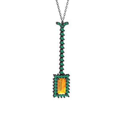 Sitrin ve kök zümrüt 925 ayar siyah rodyum kaplama gümüş kolye (40 cm gümüş rolo zincir)