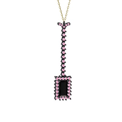Siyah zirkon ve pembe kuvars 925 ayar siyah rodyum kaplama gümüş kolye (40 cm gümüş rolo zincir)
