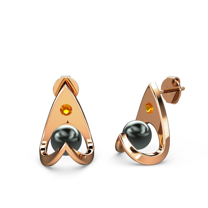 Siyah inci ve sitrin 8 ayar rose altın küpe