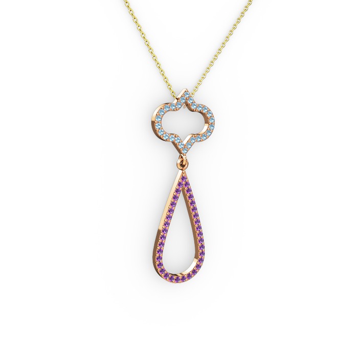 Akuamarin ve ametist 8 ayar rose altın kolye (40 cm altın rolo zincir)