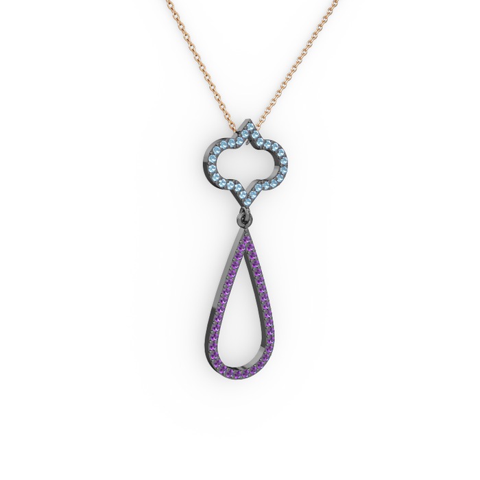 Akuamarin ve ametist 925 ayar siyah rodyum kaplama gümüş kolye (40 cm gümüş rolo zincir)