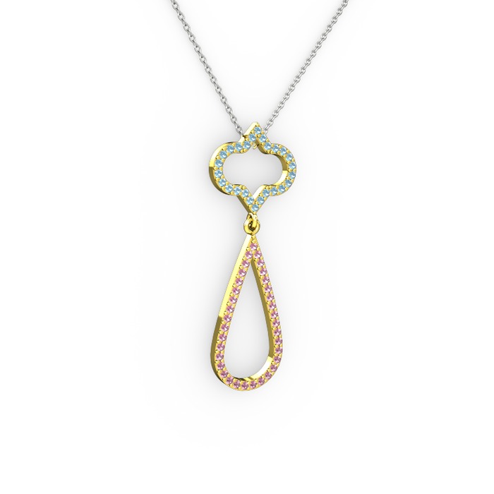 Akuamarin ve pembe kuvars 14 ayar altın kolye (40 cm beyaz altın rolo zincir)