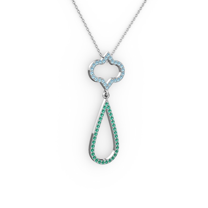 Akuamarin ve yeşil kuvars 18 ayar beyaz altın kolye (40 cm gümüş rolo zincir)