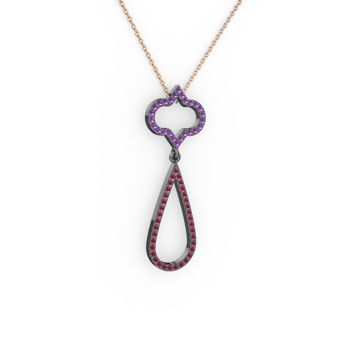 Ametist ve kök yakut 925 ayar siyah rodyum kaplama gümüş kolye (40 cm gümüş rolo zincir)