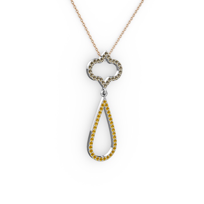 Dumanlı kuvars ve sitrin 14 ayar beyaz altın kolye (40 cm rose altın rolo zincir)