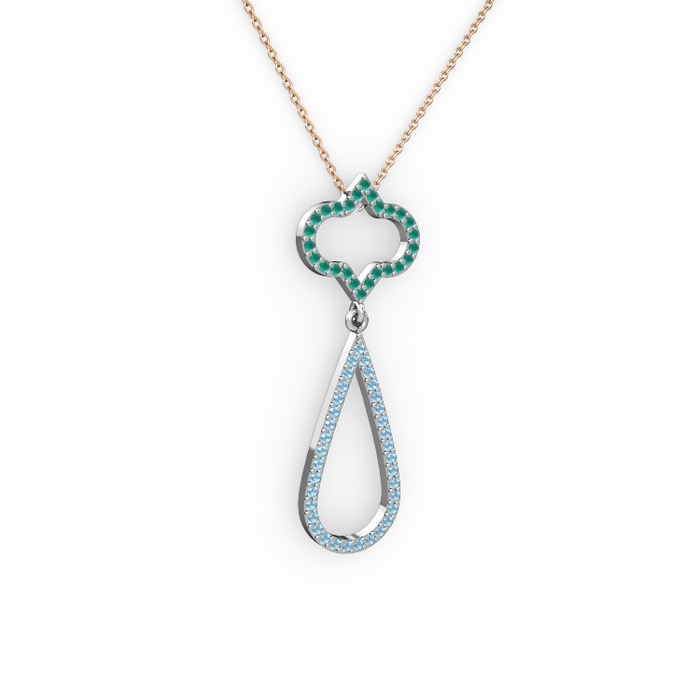 Kök zümrüt ve akuamarin 8 ayar beyaz altın kolye (40 cm rose altın rolo zincir)