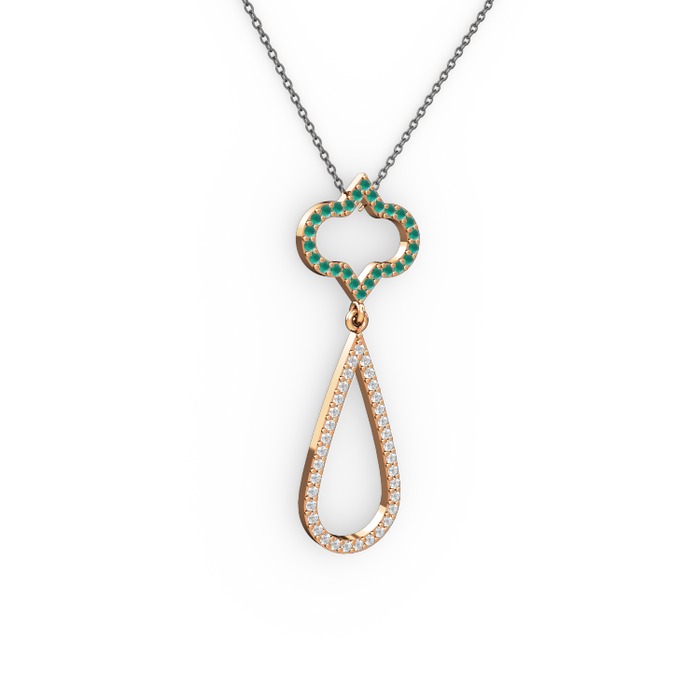 Kök zümrüt ve beyaz zirkon 925 ayar rose altın kaplama gümüş kolye (40 cm gümüş rolo zincir)