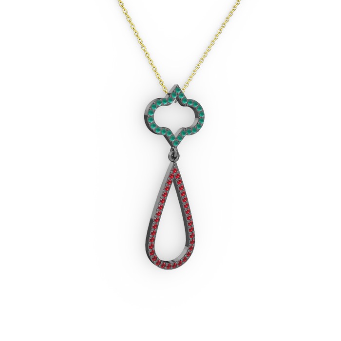 Kök zümrüt ve garnet 925 ayar siyah rodyum kaplama gümüş kolye (40 cm altın rolo zincir)