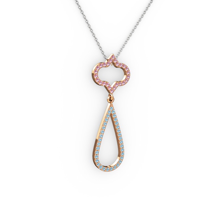 Pembe kuvars ve akuamarin 14 ayar rose altın kolye (40 cm beyaz altın rolo zincir)