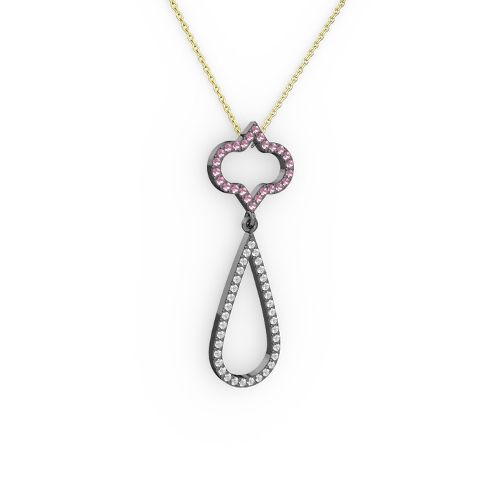 Pembe kuvars ve beyaz zirkon 925 ayar siyah rodyum kaplama gümüş kolye (40 cm altın rolo zincir)