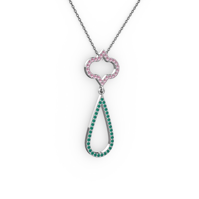 Pembe kuvars ve kök zümrüt 14 ayar beyaz altın kolye (40 cm gümüş rolo zincir)