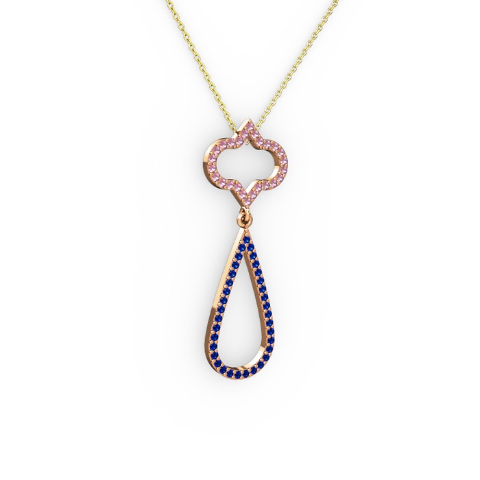 Pembe kuvars ve lab safir 8 ayar rose altın kolye (40 cm gümüş rolo zincir)
