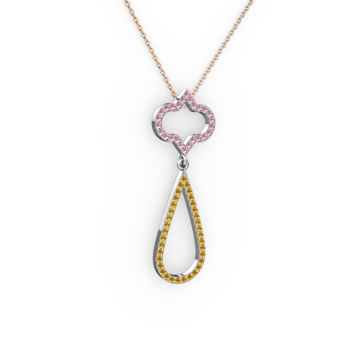 Pembe kuvars ve sitrin 8 ayar beyaz altın kolye (40 cm rose altın rolo zincir)