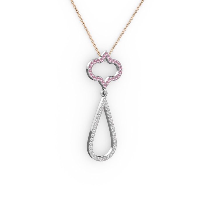 Pembe kuvars ve swarovski 14 ayar beyaz altın kolye (40 cm rose altın rolo zincir)