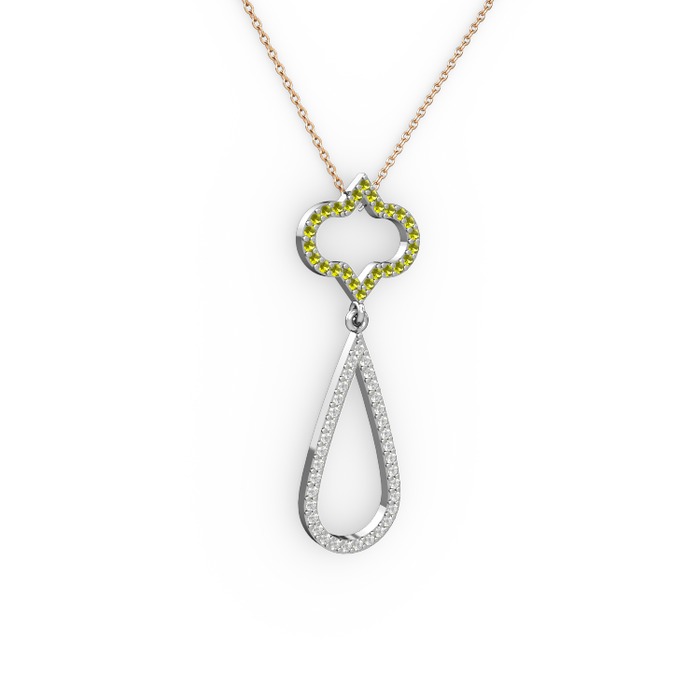 Peridot ve beyaz zirkon 14 ayar beyaz altın kolye (40 cm gümüş rolo zincir)