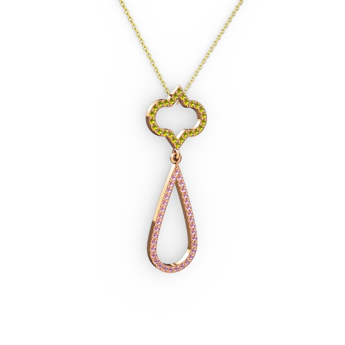 Peridot ve pembe kuvars 18 ayar rose altın kolye (40 cm altın rolo zincir)