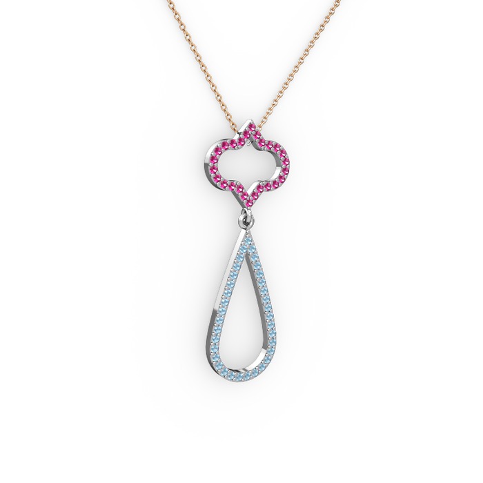 Rodolit garnet ve akuamarin 8 ayar beyaz altın kolye (40 cm rose altın rolo zincir)
